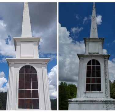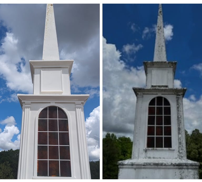 Our softwashing process safely removes algae, mold, and dirt from buildings, walkways, and high structures such as church steeples and towers.