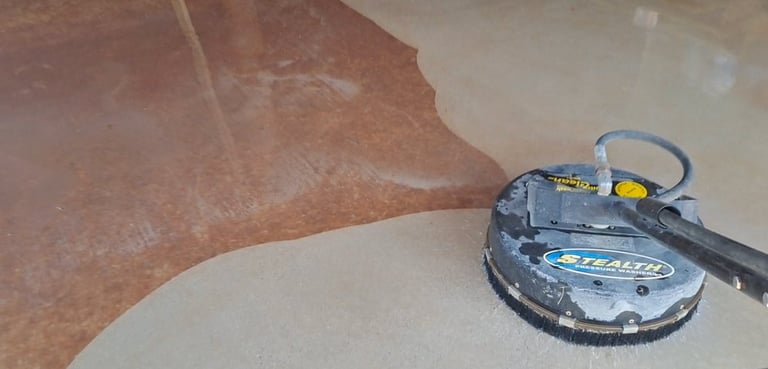 Professional driveway pressure washing removes, algae, mildew, and dirt to restore clean, bright concrete.