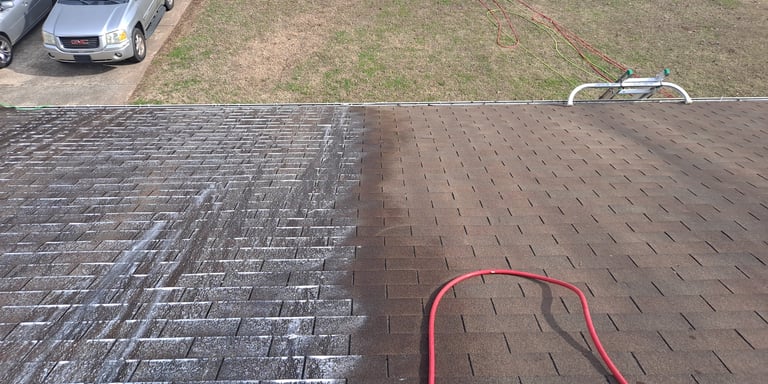 Low-pressure roof softwashing removes black streaks, moss, and algae while protecting your shingles and extending roof life.