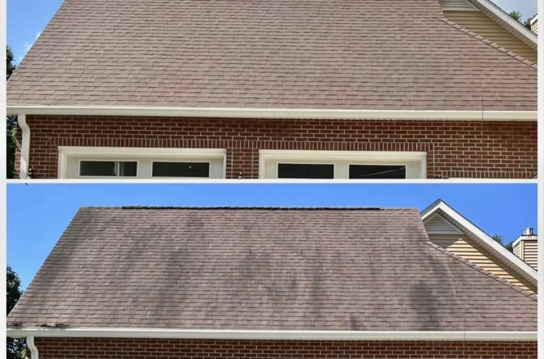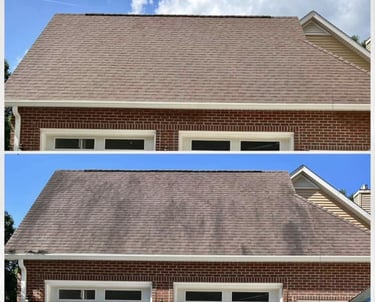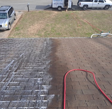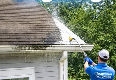 Low-pressure roof softwashing removes black streaks, moss, and algae while protecting your shingles and extending roof life.